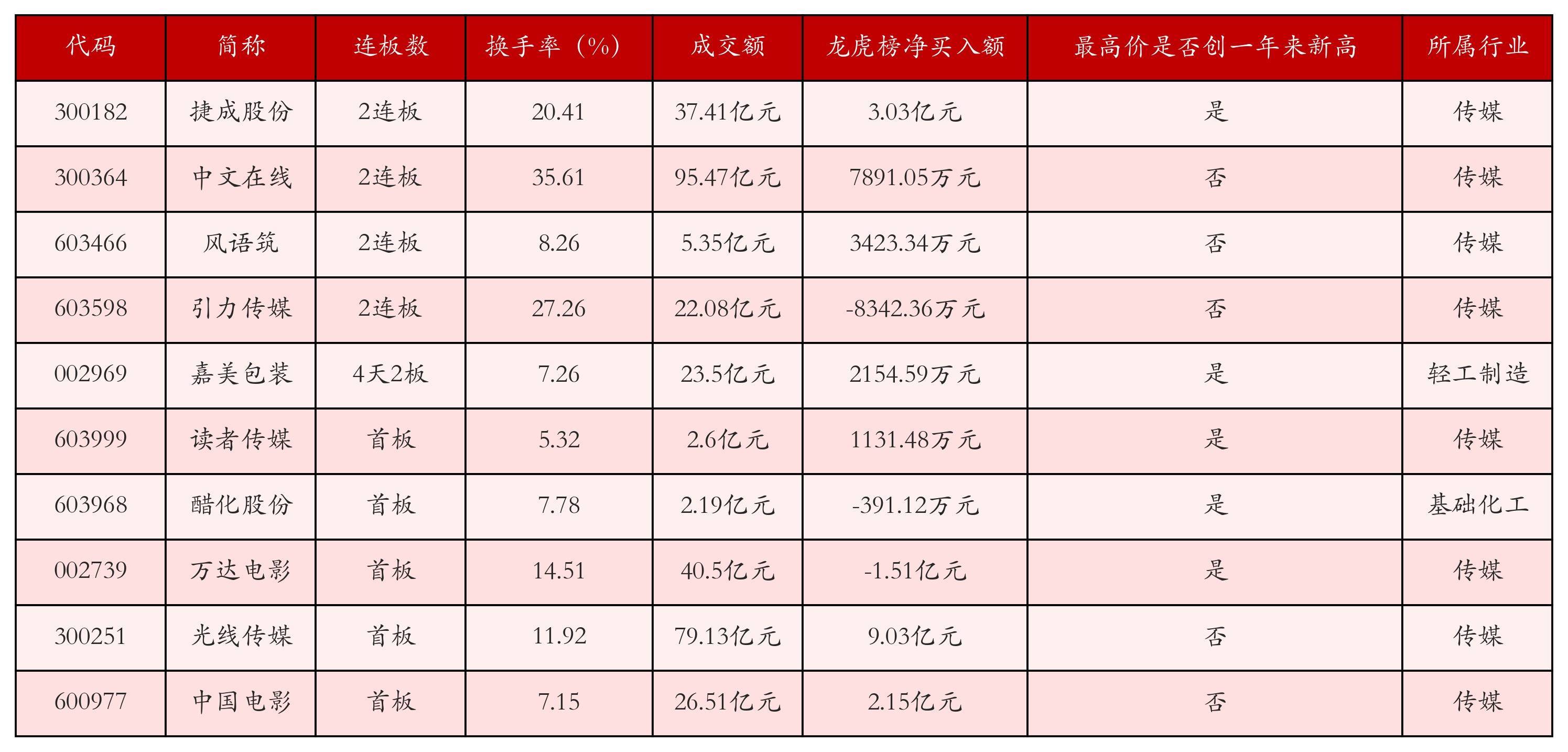 截至2月10日收盘,上证综指上涨0.13%,收于4128.37点,深证成指上涨0.02%,收于14210.63点,创业板指下跌0.37%,收于3320.54点。今日沪深两市A股共计71只涨停,综合当前连板数以及当日龙虎榜数据,其中较为强势的前三只个股分别为:捷成股份(300182)、中文在线(300364)与风语筑(603466)。今日强势个股前10位具体数据见下表: