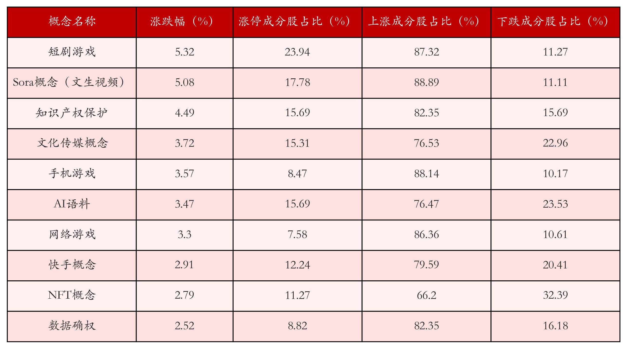 根据A股概念涨跌幅与所对应的股票池综合分析,涨幅靠前的三个概念板块分别为:短剧游戏、Sora概念(文生视频)与知识产权保护。排名前10位的概念板块相关数据见下表: